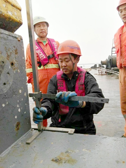 E30管节长171米,为异形曲线段管节,整体呈梯形,尾端采用钢帽设计,位于合龙口东侧。此管节安装施工难度最大,精度要求最高,更是关系到海底隧道建设成功与否的关键。E29沉管安装后,基槽龙口东西长度已不足200米,因受狭口效应影响,现场流速显著增大。烟台打捞局潜水项目部高度重视,制定合理工作的计划,严格执行E30沉管安装工艺流程,完成测量200多次,给沉管顺利对接提供了坚实而有力的数据保障。